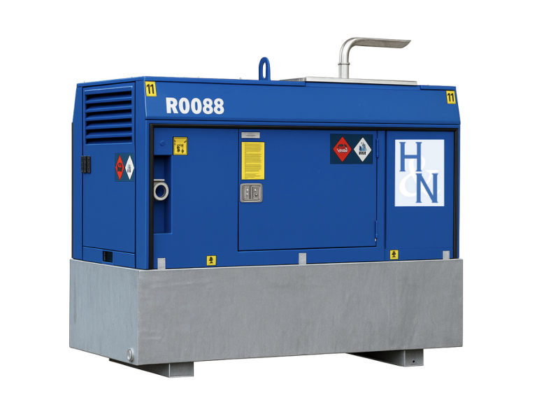 Der Aufbau des Aggregates besteht aus einer robusten Haube mit einer geschlossenen Auffangwanne. Mehrere, abschließbare Türen an den Längsseiten der Haube gewährleisten eine leichte Zugänglichkeit für Wartung / Service.