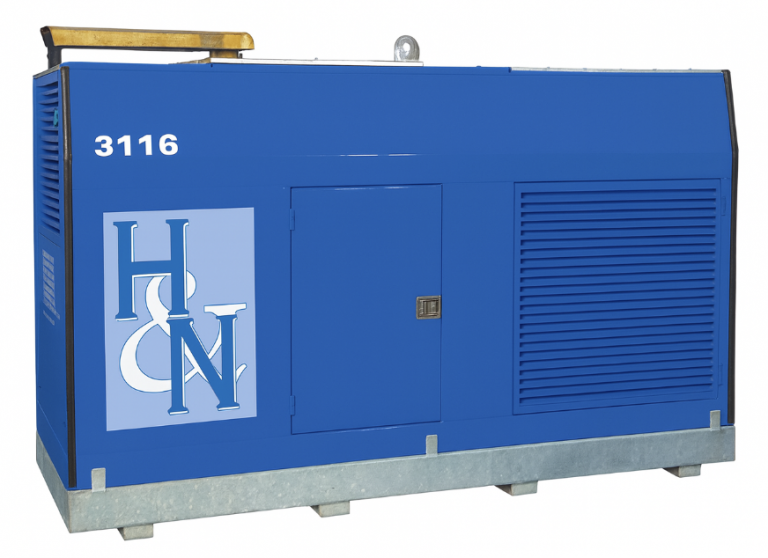 Der Aufbau des Aggregates besteht aus einer robusten Haube mit einer geschlossenen Auffangwanne. Mehrere, abschließbare Türen an den Längsseiten der Haube gewährleisten eine leichte Zugänglichkeit für Wartung / Service.